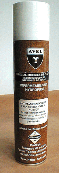 DESCRIPCION Y CARACTERISTICAS: Este producto no produce ningún efecto dañino sobre sus artículos de piel. No altera ni el color del cuero, ni la suavidad y no reseca.Como su nombre indica, el ANTIMANCHAS CUERO AEROSOL AVEL® protege, una vez aplicado, contra las manchas sebáceas (manchas grasas producidas por el roce de la cabeza o de las manos) y de las manchas alimenticias (bebidas, aceites...). Al mismo tiempo protege también contra las manchas de la lluvia, nieve y de las suciedades en general. Su prenda estará bien protegida y cuidada con este producto, ya que no obstruye el poro dejando respirar el cuero. UTILIZACION: Se emplea para los muebles (sillones, canapés, escribanías...), cazadoras marroquinería, zapatos, maletas e interiores de coches.MODO DE EMPLEO: Eliminar primeramente